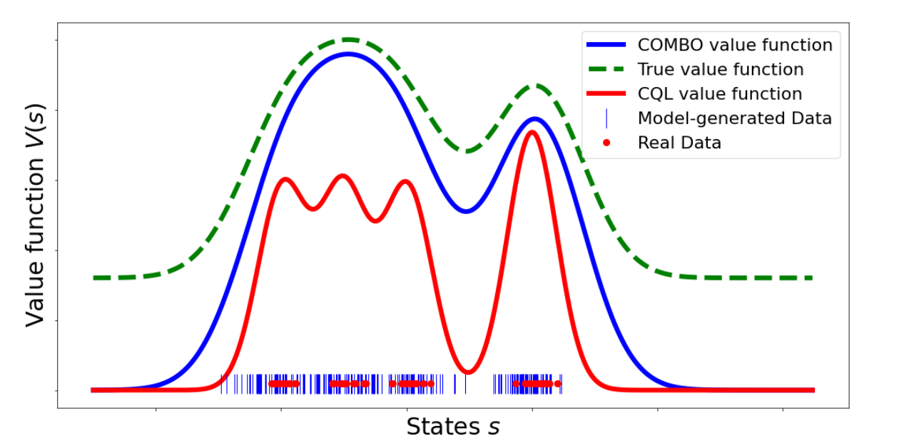先程のCQLと比べてみると,1. の項が第一項の前半部分に,3. の項が第二項と第三項に置き換わっていることが分かります.直観的な説明をすれば,一般的なTD学習を表す第二項に対し,第三項はデータ拡張をしているとみることができ,学習したモデル $\widehat{\mathcal{M}}$ から得られるデータを一定量TD誤差学習に混ぜて汎化性を向上しています.一方,実データではない $\widehat{\mathcal{M}}$ から得られたデータはモデリングバイアスを含んでいたり不確実性が大きくなったりと信頼性は低いため,第一項でなるべく価値を保守的に見積もるようにし,過大評価を抑制しつつ汎化した価値学習が行えるようになっています.実際,COMBOはCQLよりもタイトな価値の推定下界を最大化する方策を獲得できることが理論的に示されています.