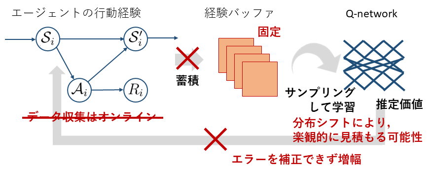 ここまでの議論を見ていると,前章で扱ったオフポリシーの強化学習であっても,経験バッファに蓄積したデータを使って近似価値関数を学習する以上,オフラインの場合と似た問題は起こるのではないか?という疑問が湧いてくるかもしれません.それはとても鋭い指摘で,実はオフポリシーの場合でも,分布シフトの問題は発生しています.ではなぜオフポリシーの場合ではうまく学習できていたのか,ここではオフラインとの違いも含めて明らかにしていきます.
