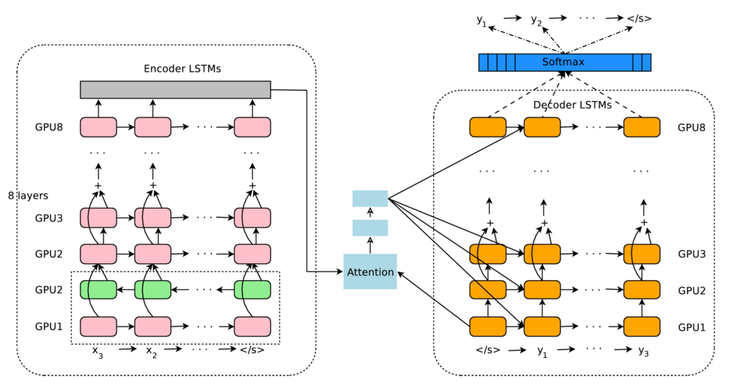 GNMTはSeq2Seqフレームワークにアテンションモジュールを加えたもの(Encoderネットワーク、Attentionモジュール、Decoderネットワーク)で構成されている。