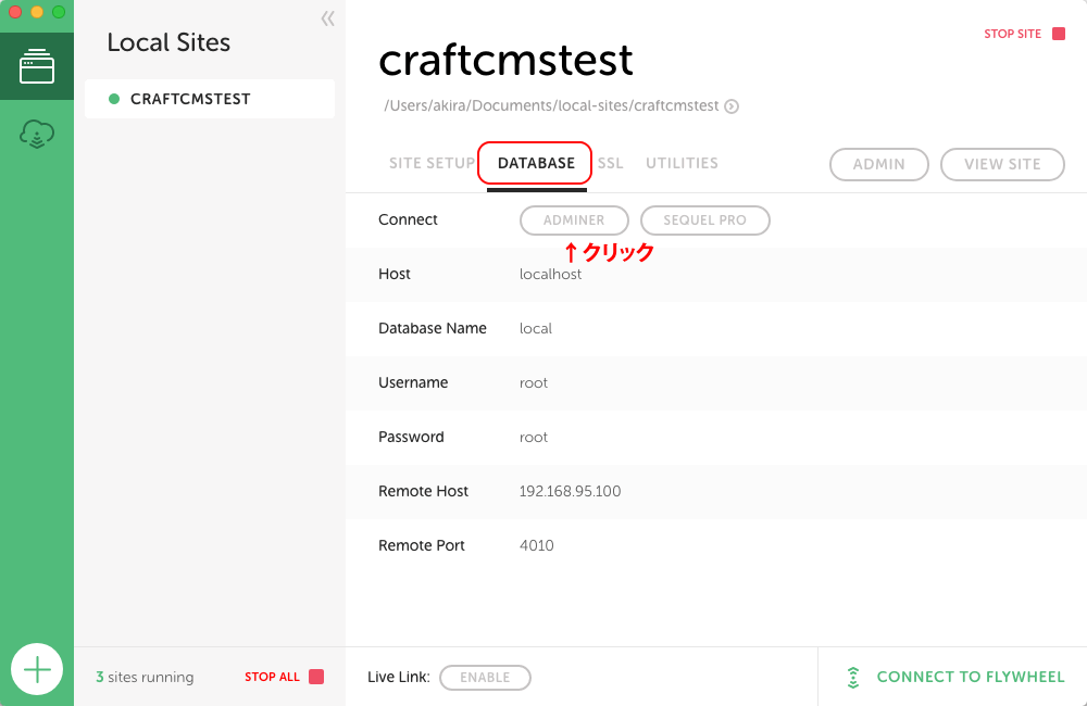 3)データベースの編集を行います。 Local by Flywheelに戻り、サイト設定の「DATABASE」タブを選択後、Connectから「ADMINER」ボタンをクリック