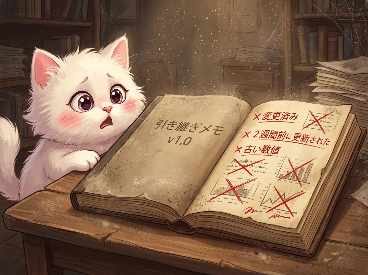 コードを変えたけどメモは更新していない、議事録は書いたけど決定事項が変わっている、仕様書が初期版のまま。どれか1つでも当てはまったら、原因はそこです。