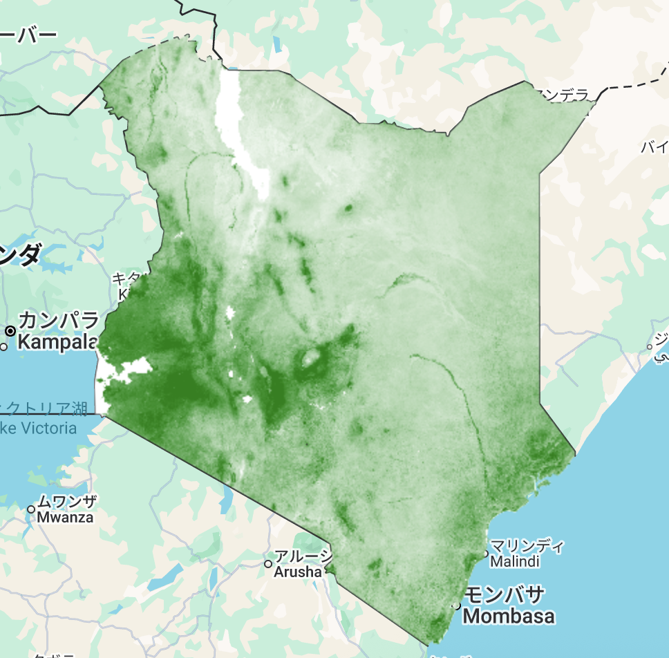 前処理済みの合成画像(image)を地図に追加。.clip(roi)でケニアの領域で画像を切り取り。 |