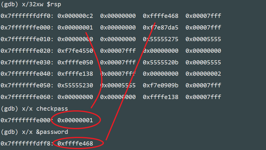 実際に、x/x checkpassや、x/x &passwordの出力結果と、x/32xw $rspの出力結果を照らしあわせて見ると、確かに、各々の該当アドレスに変数の値が入っています。