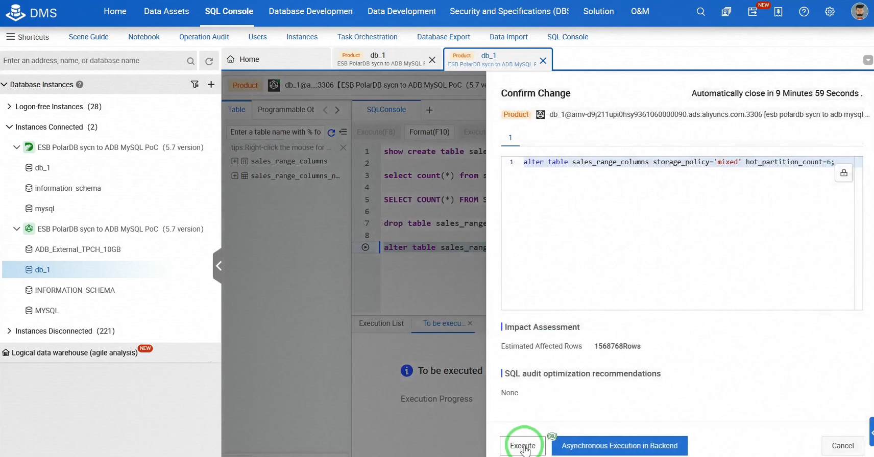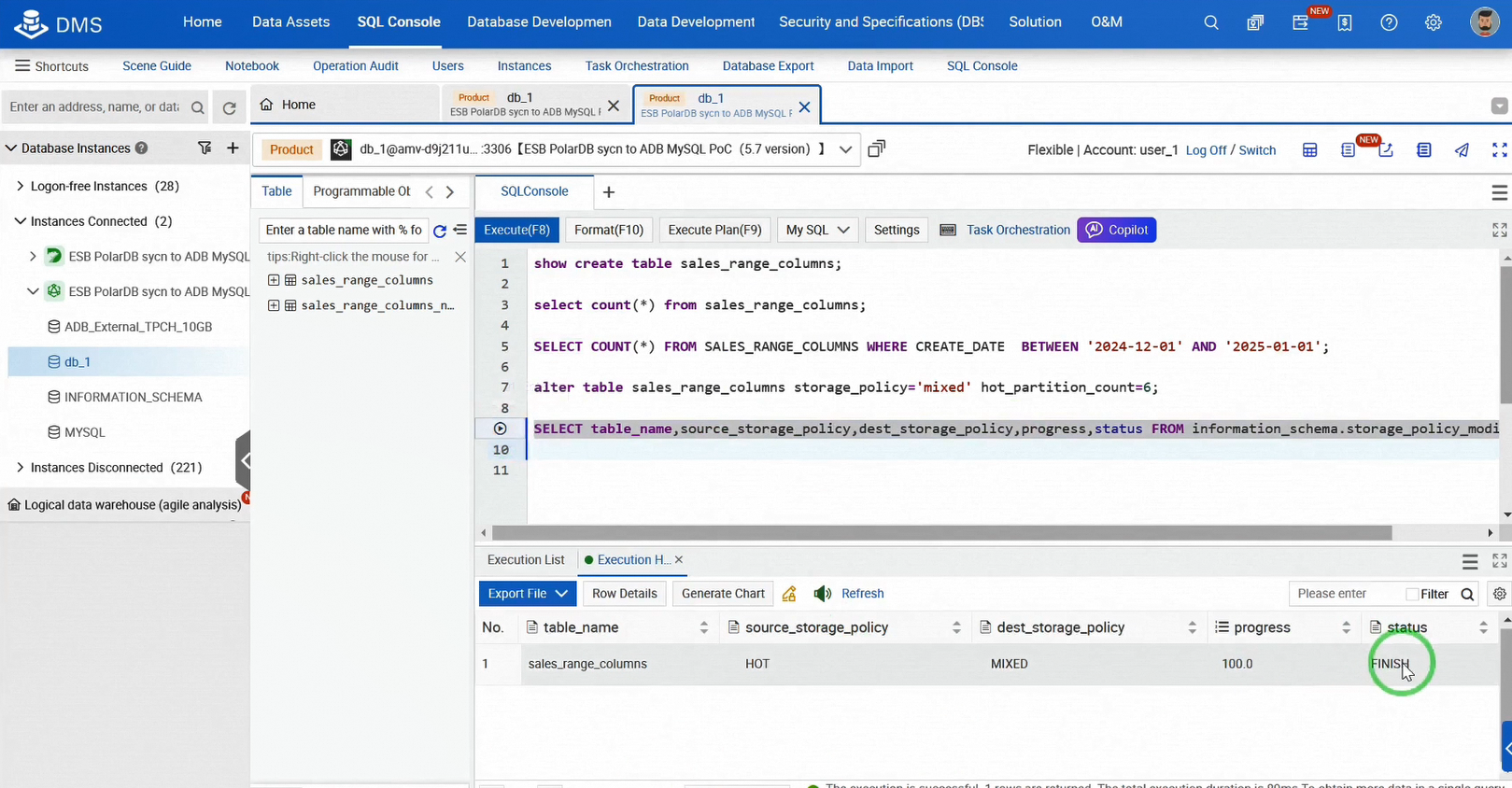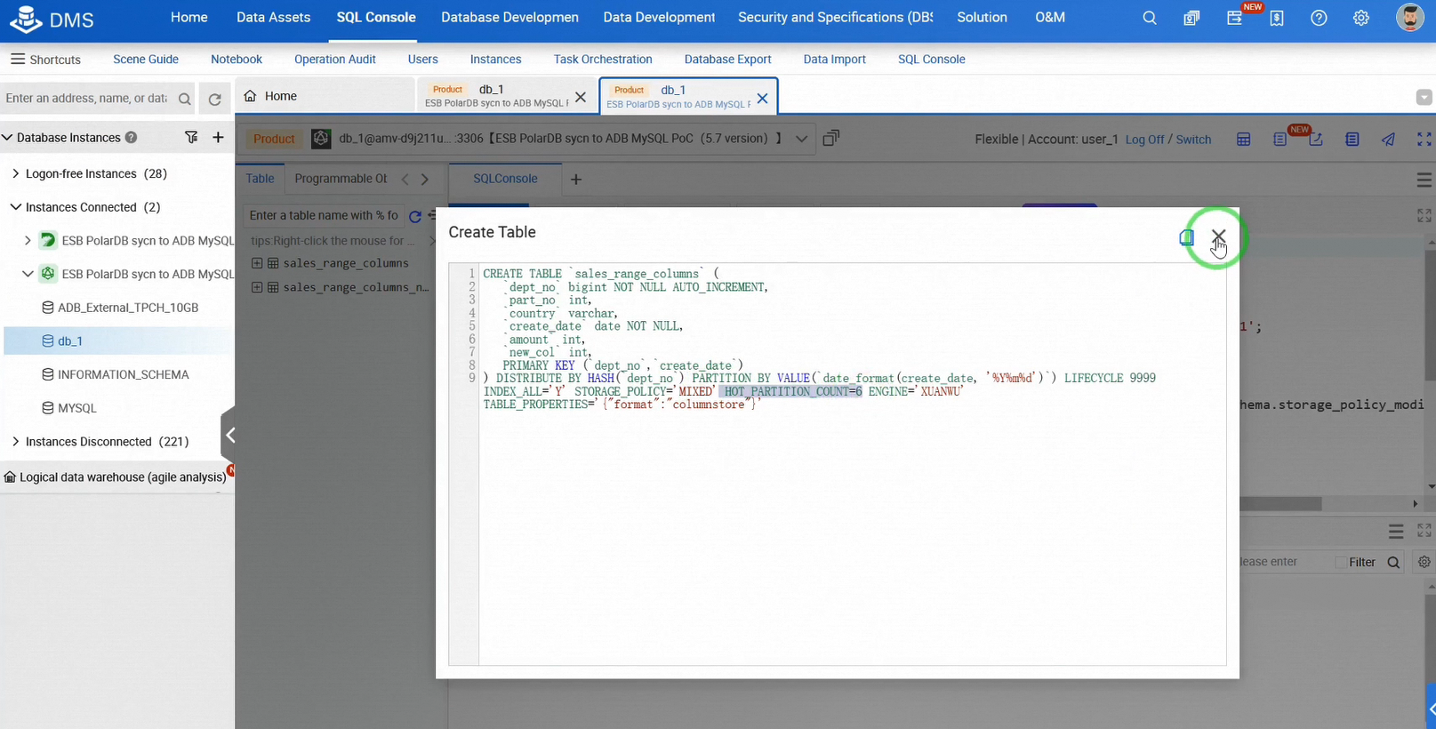 これまでのところ、OLTPデータベースであるPolarDBからOLAPデータベースであるAnalyticDBへのリアルタイムデータ同期を確立し、増分データ同期テストを完了しました。次に、AnalyticDBでホット/コールドデータの階層化を開始しましょう。これは迅速かつ簡単です。AnalyticDB SQLコンソールにログインします。テーブルのストレージポリシーを調整して、階層化ストレージを実装し、ホットパーティションの数を定義します。ホットパーティション内のレコードはホットストレージに留まり、それ以外のレコードは自動的にOSSにアーカイブされます。