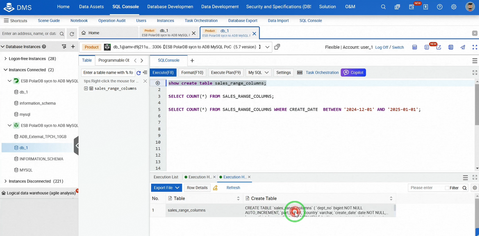 ここで、db_1という1つのデータベースと、sales_range_columnsという名前のテーブルがあります。