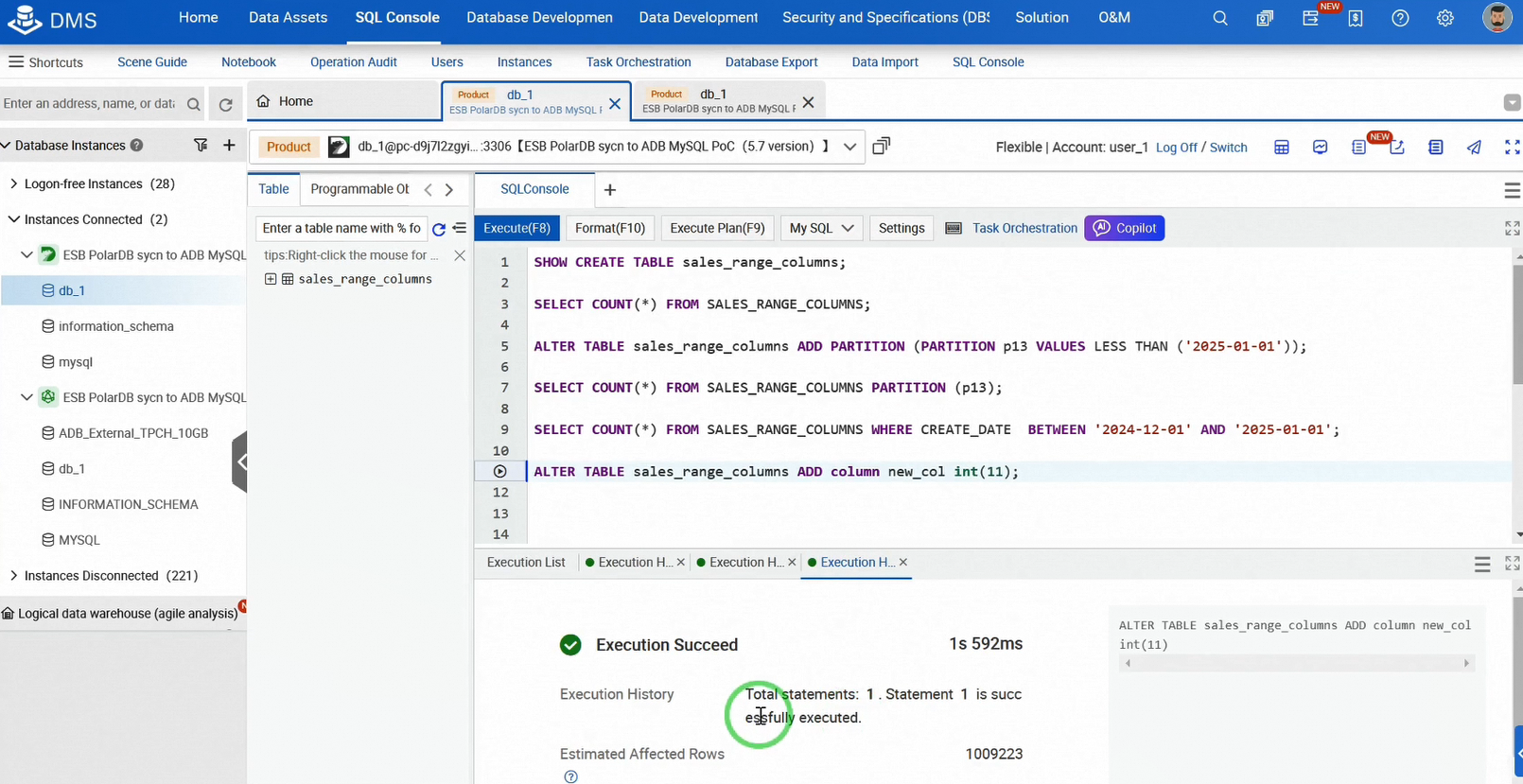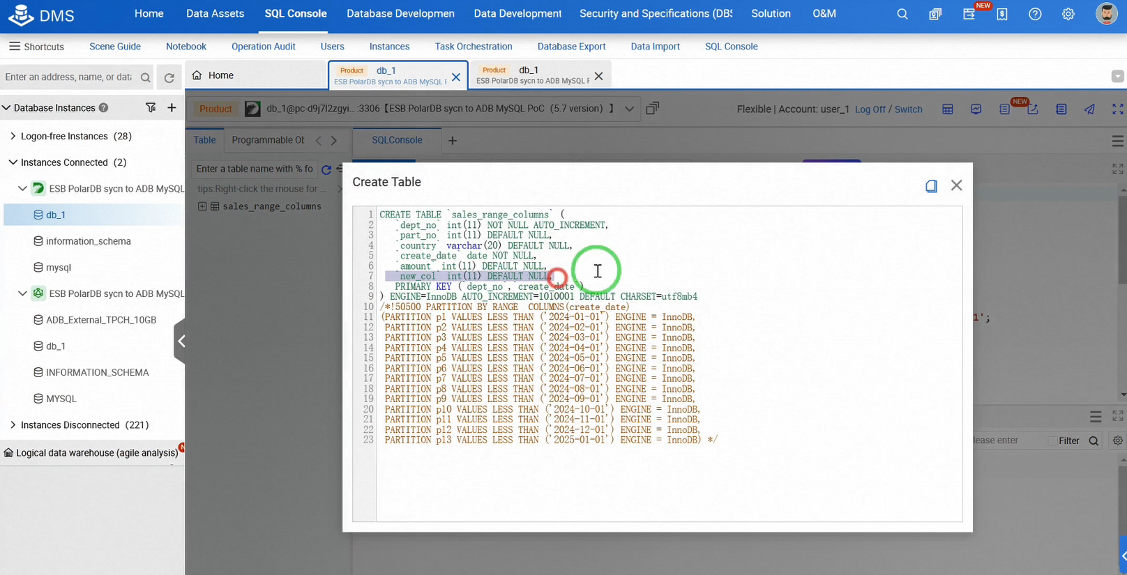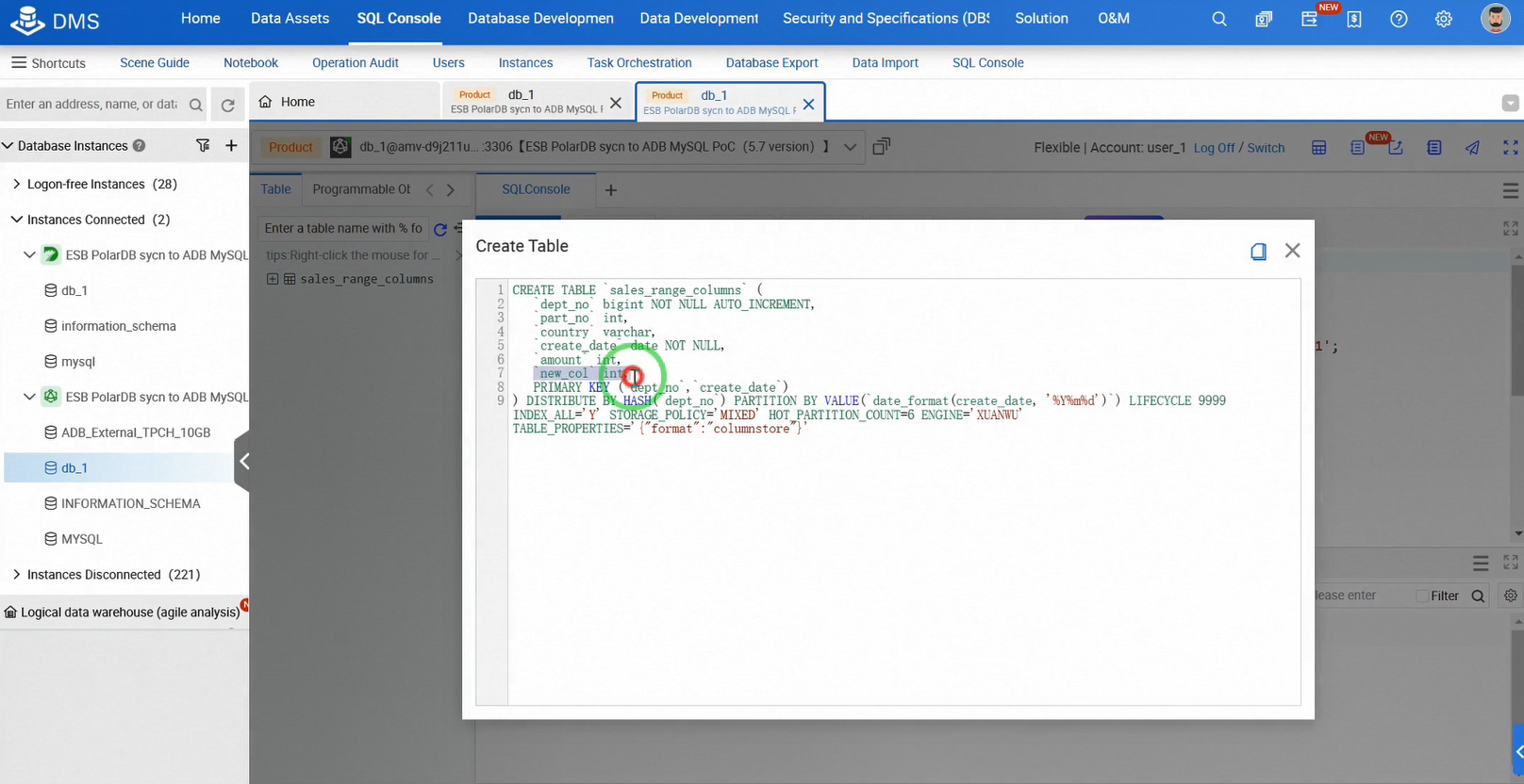 次に、PolarDBのソーステーブルに列を追加し、自動的に同期されるかどうかを確認しましょう。PolarDB SQLコンソールでテーブルに列を追加するDDL操作を実行します。テーブルスキーマを確認して、変更が適用されたことを確認してください。