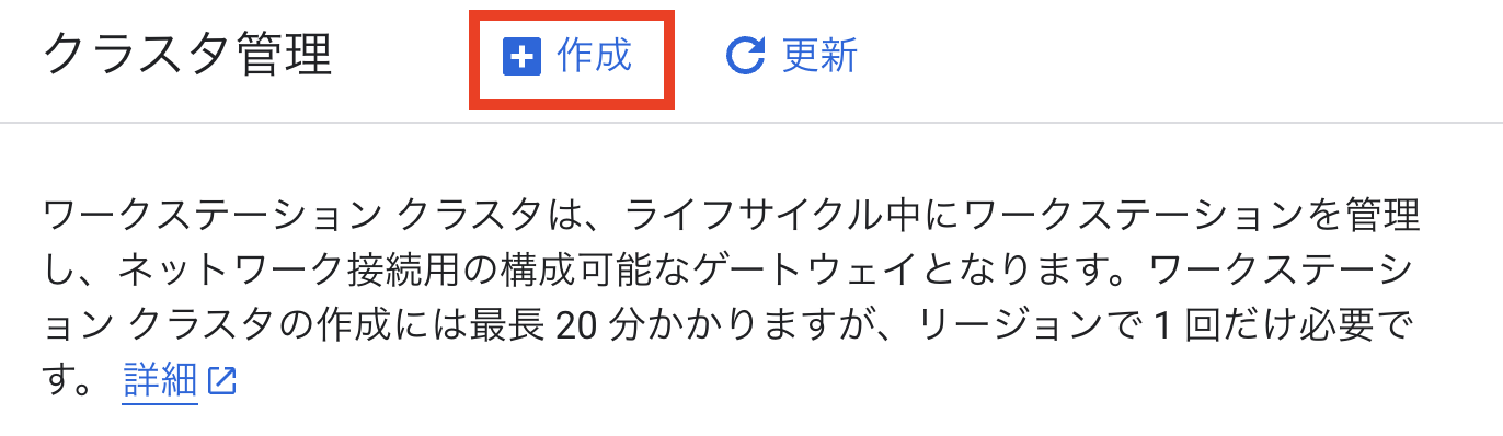 ワークステーションクラスタは、複数のワークステーションを管理するものです。Google Cloud リージョンごとに一度だけクラスタを作成する必要があります。