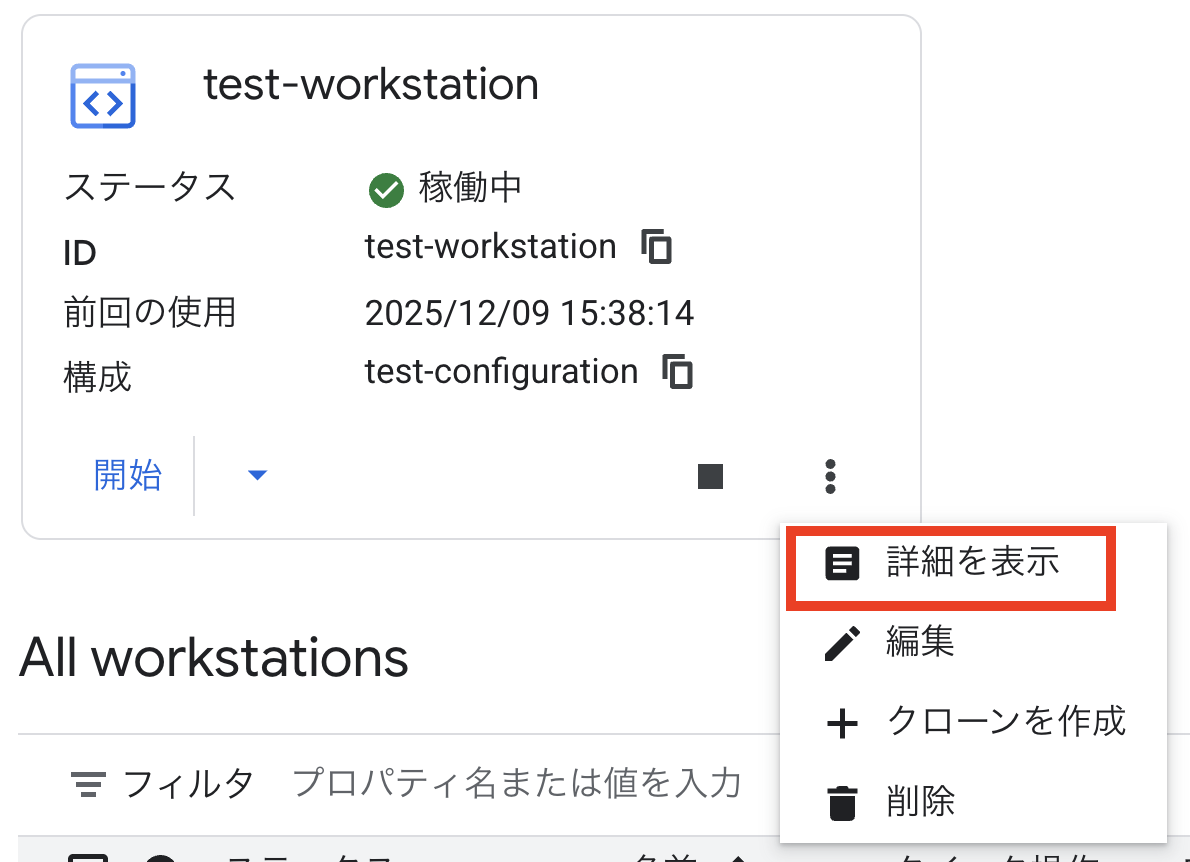まず、ワークステーション名を調べる必要があります。Cloud Workstations のワークステーションページで「詳細を表示」リンクをクリックしワークステーション名を確認できます。
