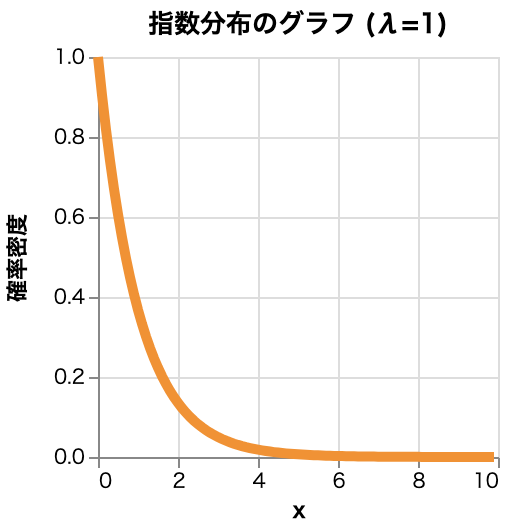 | 指数分布 | $f(x)=\begin{cases} \lambda e^{-\lambda x} & x\ge 0 \\ \ \ 0 & x\lt 0 \end{cases}$ | λ | $\frac{1}{\lambda}$ | $\frac{1}{\lambda^2}$ |