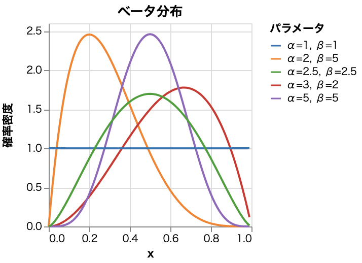 | ベータ分布 | $\begin{align} f(x)&=\frac{x^{\alpha-1}(1-x)^{}}{B(\alpha, \beta)} \\ &0\le x\le 1 \end{align}$ | $\alpha, \beta$ | $\frac{\alpha}{\alpha+\beta}$ | $\frac{\alpha\beta}{(\alpha+\beta)^2(\alpha+\beta+1}$ |
