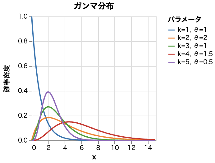 | ガンマ分布 | $f(x)=\begin{cases} \frac{1}{\beta^{\alpha}\Gamma(\alpha)}x^{\alpha-1}e^{-\frac{x}{\beta}} & x\ge 0 \\ \ \ 0 & x\lt 0 \end{cases}$ | $\alpha, \beta$ $k, \theta$とする場合もある ($\alpha=k,$ $\beta=\frac{1}{\theta}$) |
