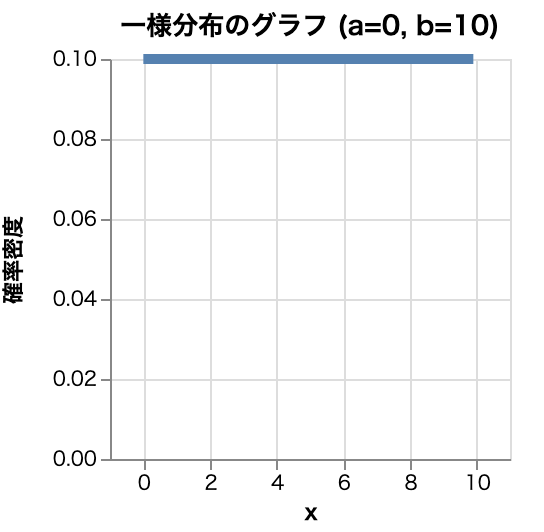 | 一様分布 | $f(x)=\begin{cases} \frac{1}{b-1} & a\le x\le b \\ \ \ 0 & x\lt a, x\gt b \end{cases}$ | 最小値 a、最大値 b | $\frac{a+b}{2}$ | $\frac{(b-a)^2}{12}$ |