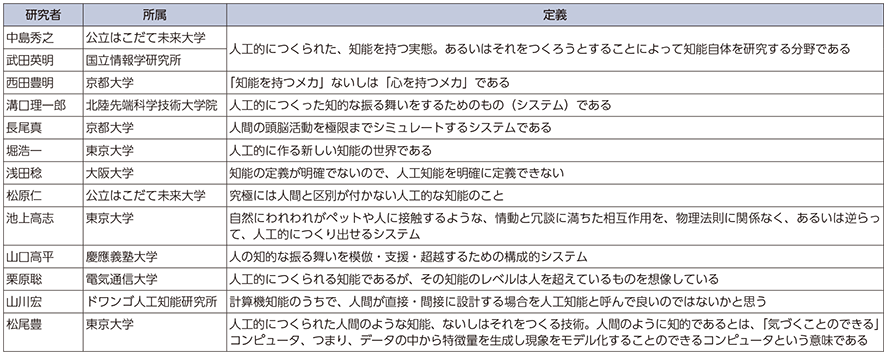 - 以下のように、研究者により定義が異なり定まった定義はない状況。そもそも「知能」自体の定義が定まっておらず、また次に示す「AI効果」もあり、明確な定義は難しいものと思われる。