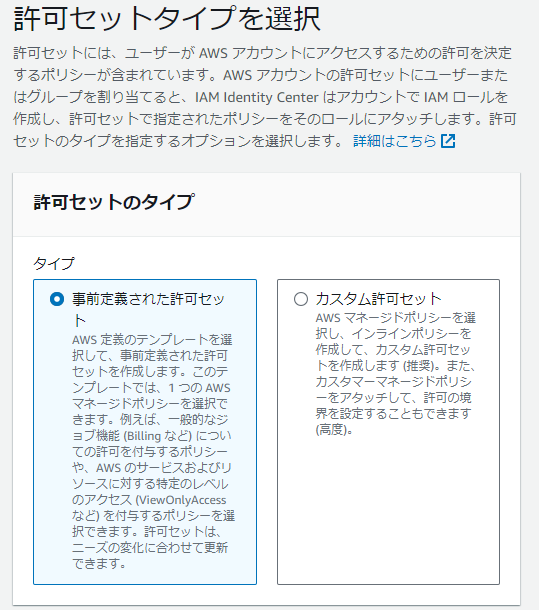 IAM ポリシーを 1 つ以上、複数の AWS アカウント にデプロイすることができるテンプレートのことです。 許可セットを AWS アカウント に割り当てると、IAM アイデンティティセンターが IAM ロールを作成し、IAM ポリシーをそのロールにアタッチします。