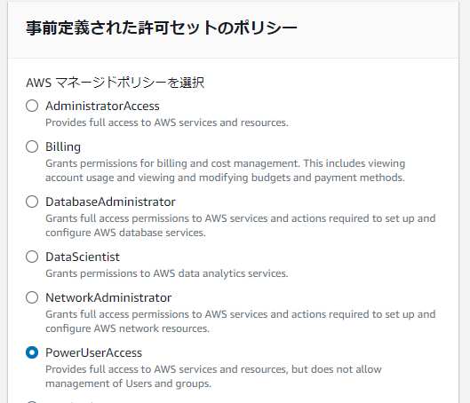 - PowerUserAccess:AWS サービスとリソースへのフルアクセス権限があるが、ユーザーとグループの管理はできない。次に設定するSSOを使用するために、この許可セットを選択する