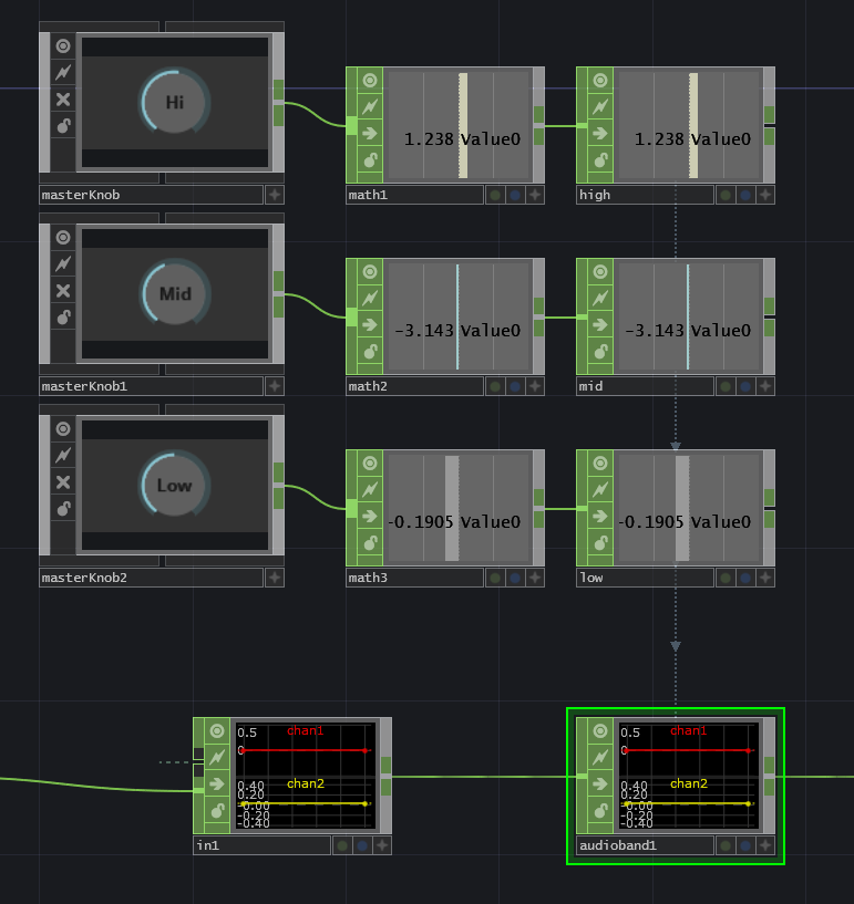 イコライザーはAudio Band EQの、High / Middle/ Lowそれぞれの周波数をknobの出力でコントロールします。