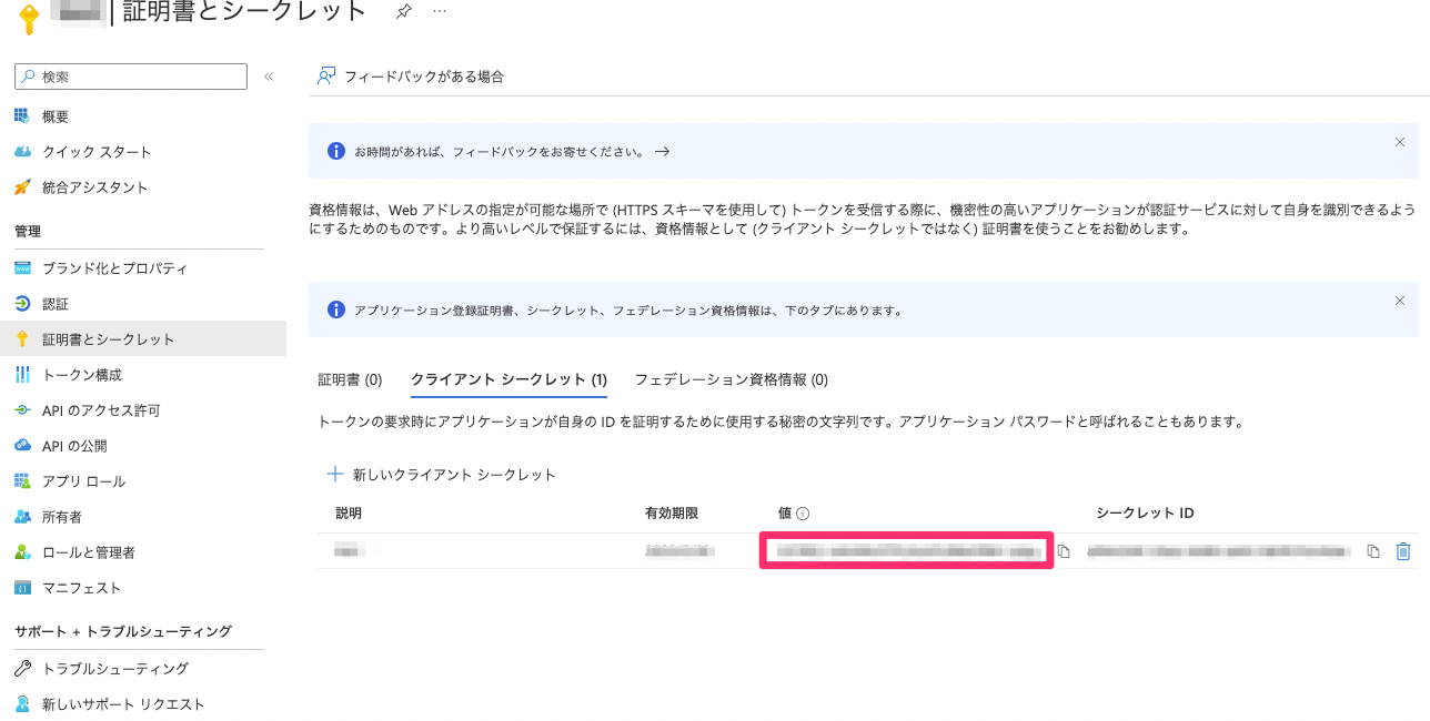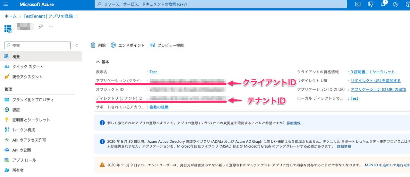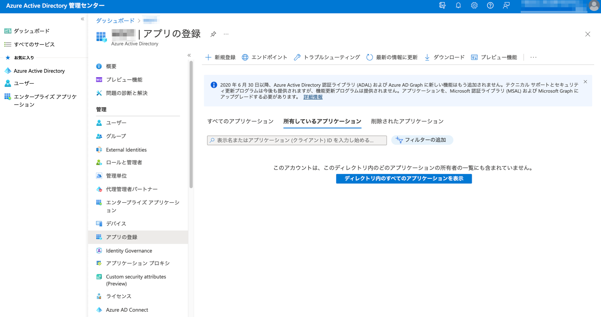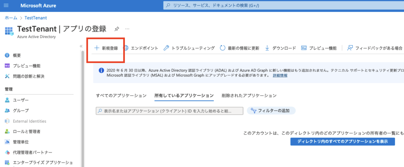 左側にあるタブからアプリの登録を選択し、アプリの新規登録をします。
