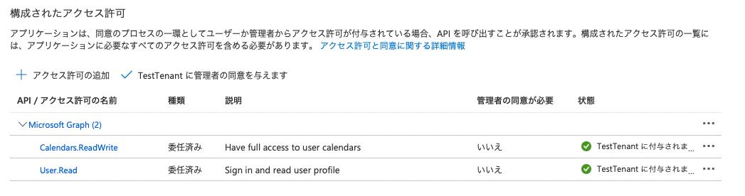 管理者の同意を付与し、追加したアクセス許可を使用できる状態にします。