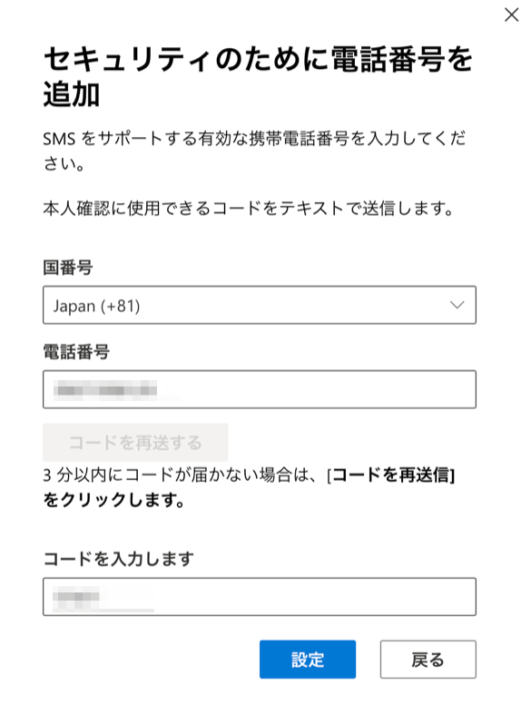 本人確認のため、SMSメッセージを設定した電話番号に送り、コードを入力し設定します。