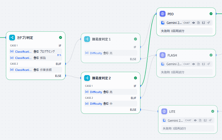 例えば、「プログラミング」や「推論」では Pro または Flash のどちらかしか選択されないルートに流れます。 その後、「難易度」によってどちらかを選択するようにしています。