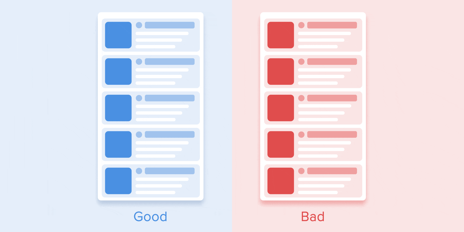 リスト項目(ニュースカード、Eメールリストなど)は、表示されるまでに少し時間がかかり、新しい要素の出現には、各々20~25ミリ秒かける必要があります。これより要素の表示が遅いと、ユーザーはストレスを感じるかもしれません。