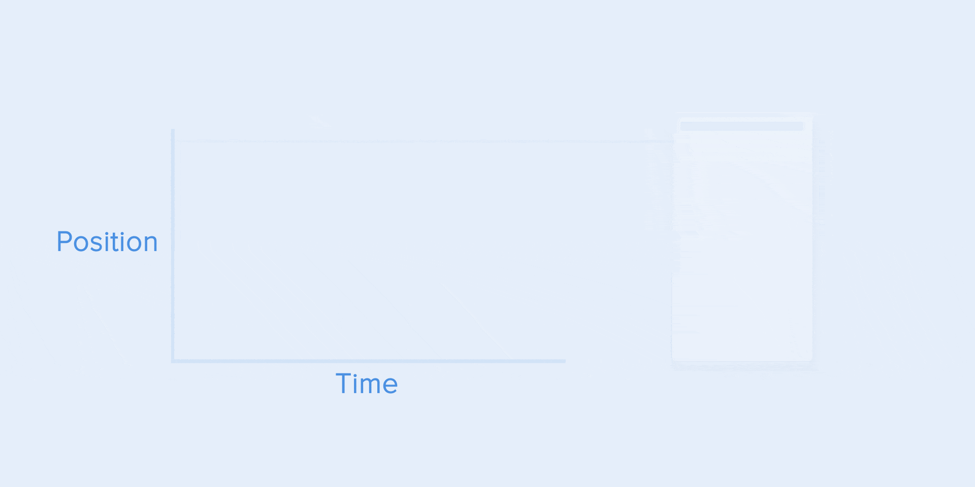 アプリケーションのためのアニメーションには、アニメーションカーブを使用します。それらについてお話します。アニメーションカーブは、同じ時間間隔を表す(x軸)の間にオブジェクトの位置(y軸)がどのように変化するかを示しています。今回の例では、動きが直線的であるためオブジェクトは同期間に同じ距離を移動します。