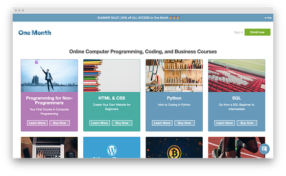 その名の通り、たった1ヶ月でプログラミング言語を学べるプラットフォームです。One Monthはブートキャンプのようなもので、Python、Ruby、JSの基本的な概念を最も効果的な方法で習得できます。Command-Line 1など一部のコースのみが無料で、ほとんどのコースは有料です。