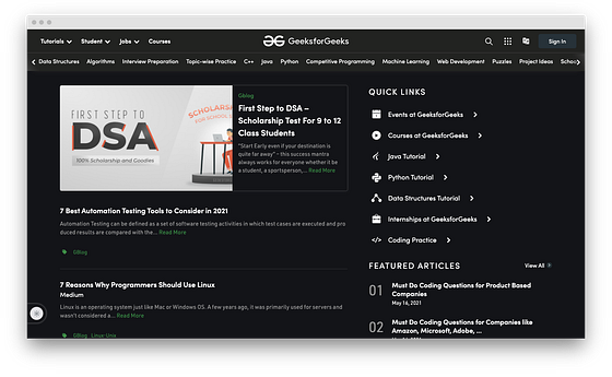 プロジェクトを参考にしたい、プログラミングに関する情報記事を読みたい場合は、Geeksforgeeksが最適です。すべての概念が、すべてのライターによって独自の方法で徹底的に説明されています。このウェブサイトの寄稿者達は、有名な技術専門家です。チュートリアルでは、1つのプログラミング関連の問題に対処するためのさまざまな方法を紹介しています。