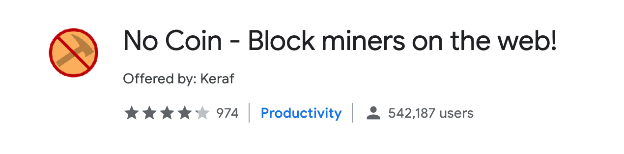 世の中には、CPUに暗号通貨をマイニング(採掘)させるWebサイトがあります。No Coinは、Coinhiveなどの利用者の同意なしでコンピュータのリソースを使用するコインマイナー(採掘者)をブロックすることを目的とした小さなブラウザー拡張機能です。