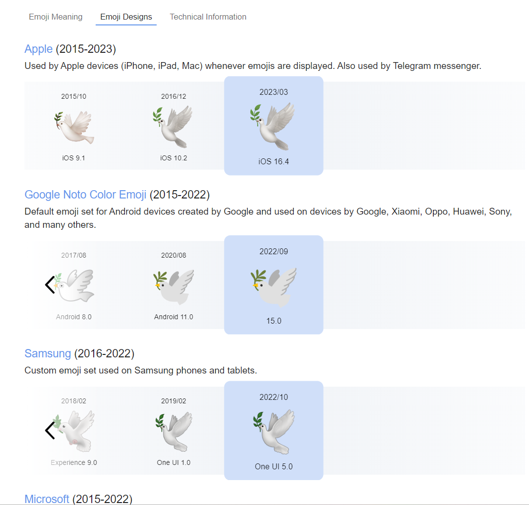 Emojipediaというサイトで、様々なデバイスやサービスでの絵文字の見え方を確認できます。