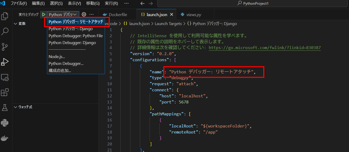 の定義を変更して、debugpy を通してDjangoアプリを起動し、外部のエディタからデバッグできるようにしています。