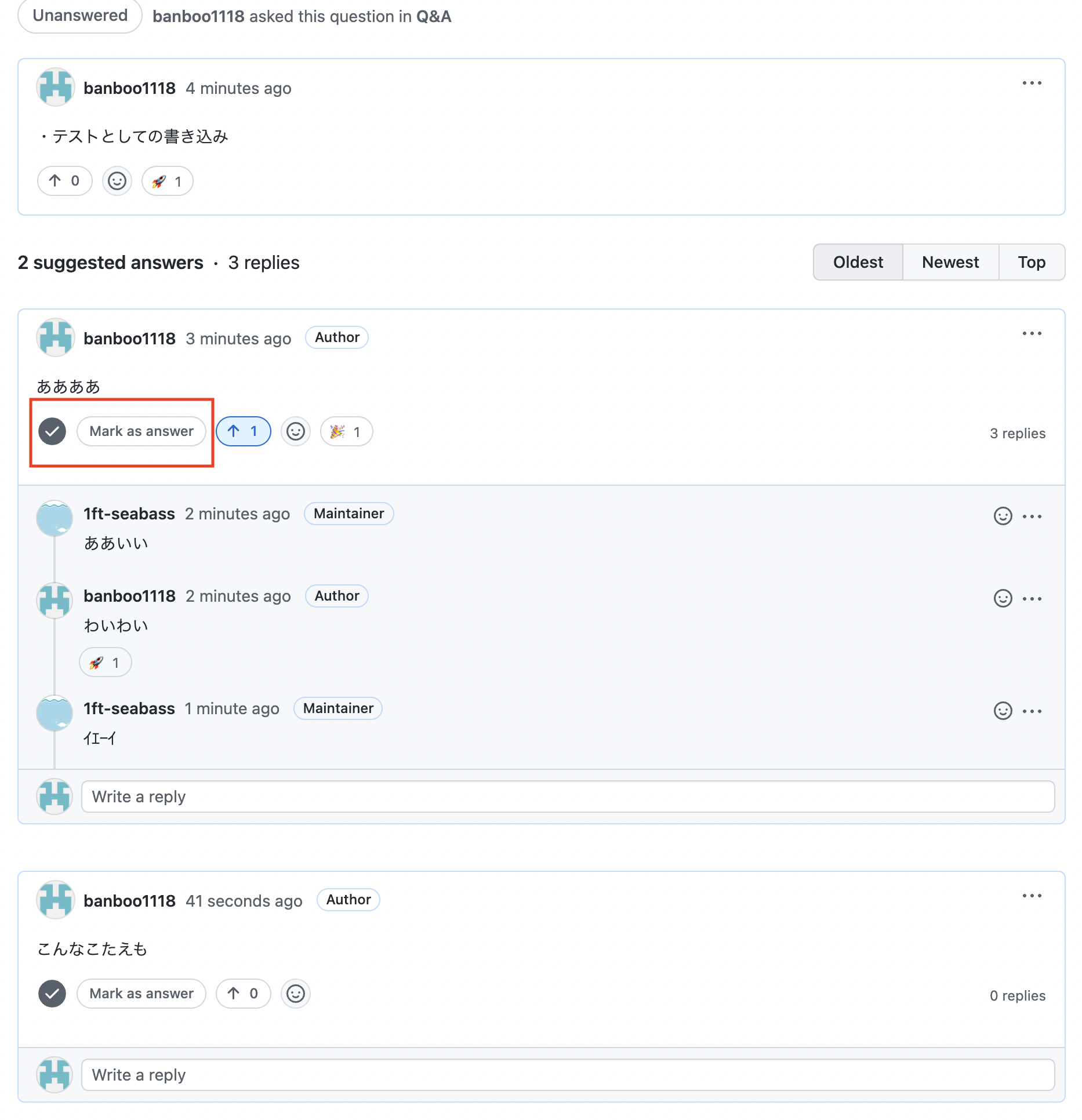 - 解決したら、回答をGitHub Discussionsに書き込みMake as Answerをオンする
