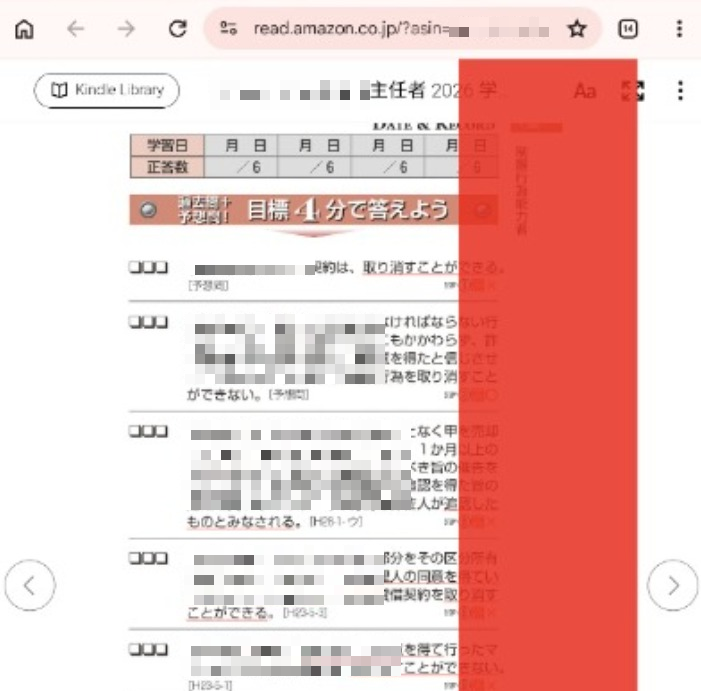 Kindle版の資格試験問題集などをタブレットで解く際、回答が問題のすぐ後に「赤文字」で記載されていると、物理的に指や紙で隠しながら読み進める必要があり、学習のリズムが削がれます。