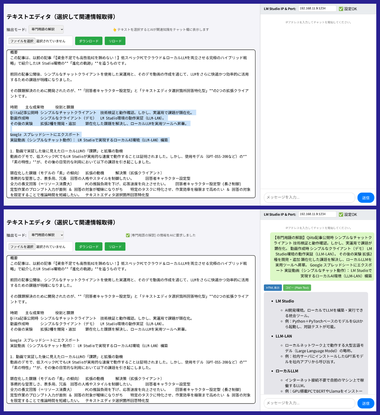 知識抽出型クライアントでは、シンプルなチャットでは難しかった「文書の特定部分に対する作業」を可能にし、実用的な速度と精度を目指しました。