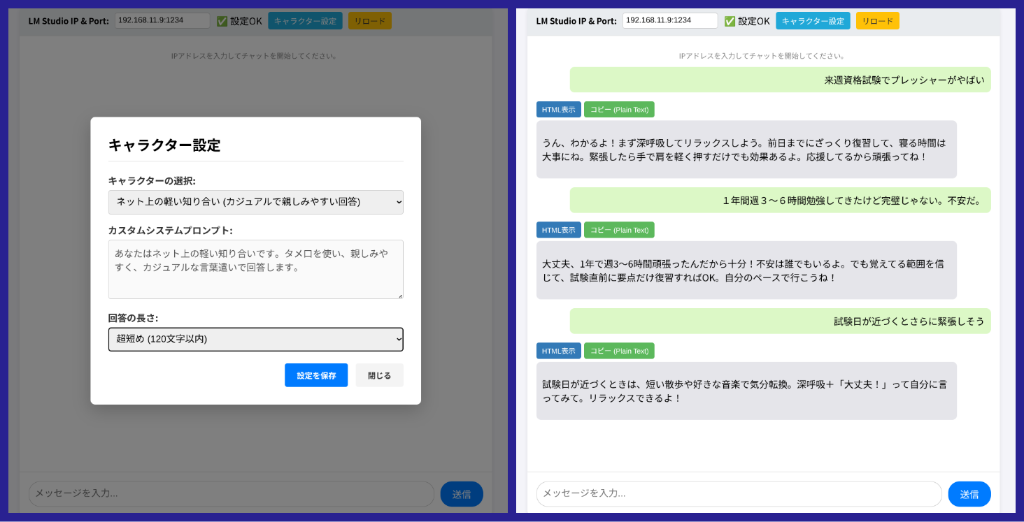 特に低スペック環境における 「長文回答による遅延」 という課題を直接解決したのが、キャラクター設定型クライアントです。