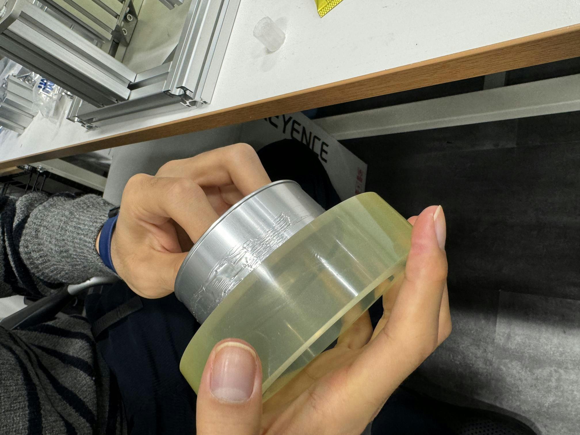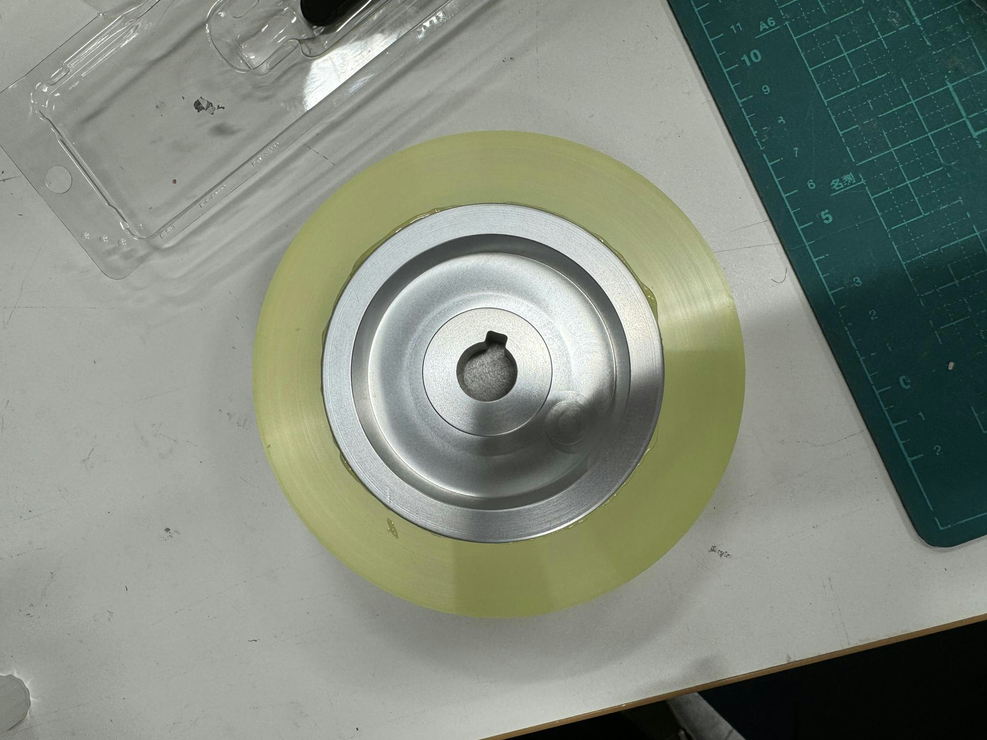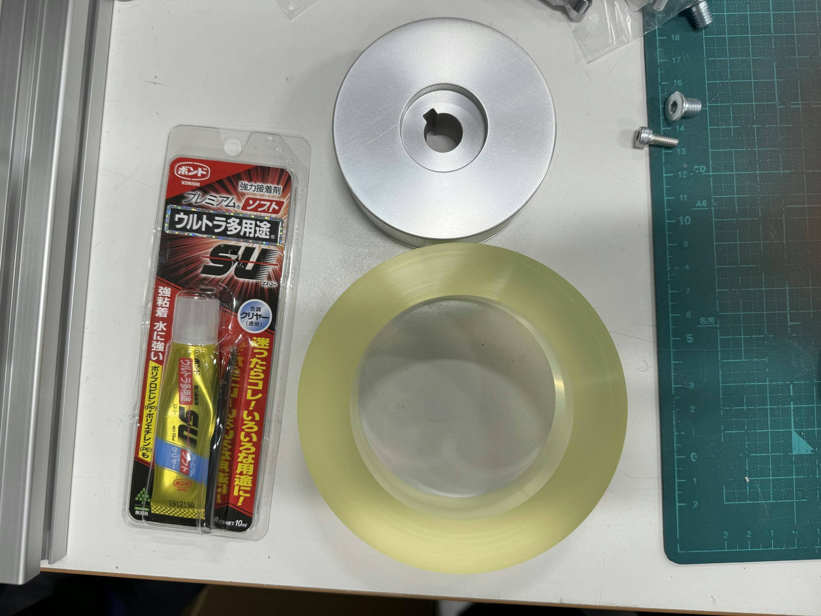 その後駆動輪ホイール(MVTUP-APW-456-7J5B4)の円周部分に接着剤を塗り拡げていきます。薄めが良いです。へらなどを用いて伸ばしていってください。