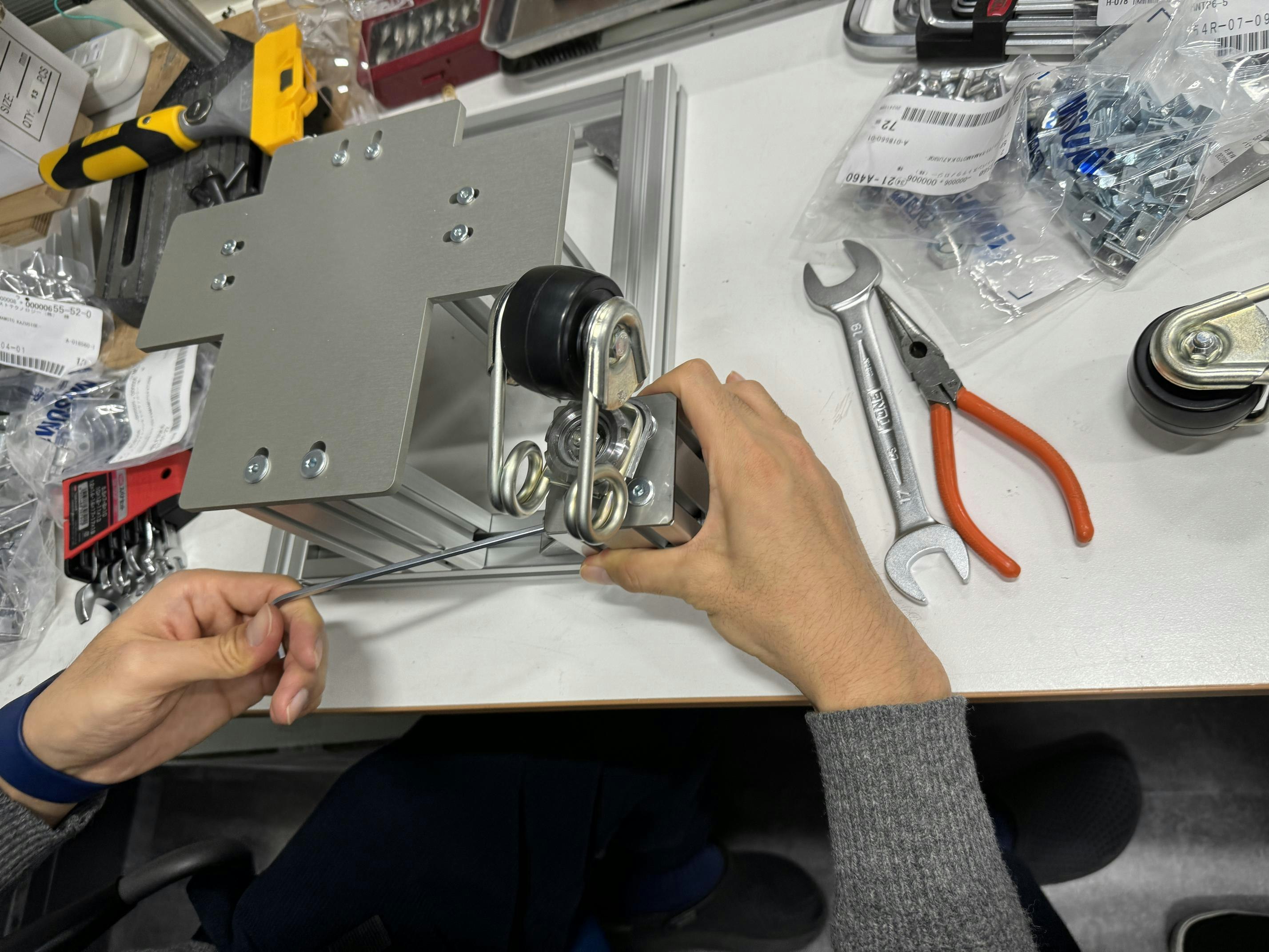 キャスター取り付けプレートの中央の穴にキャスタの棒を通し、2個のM12ナットで固定します。