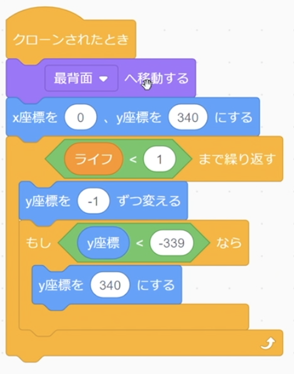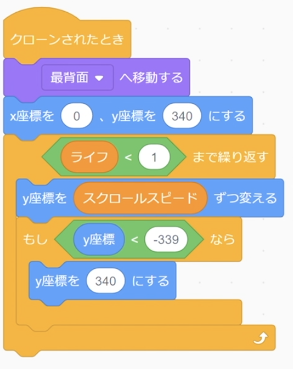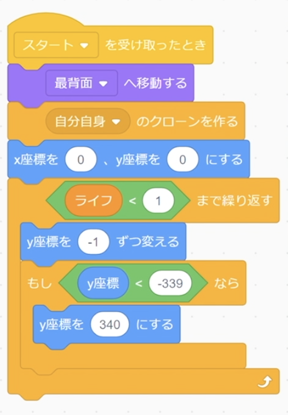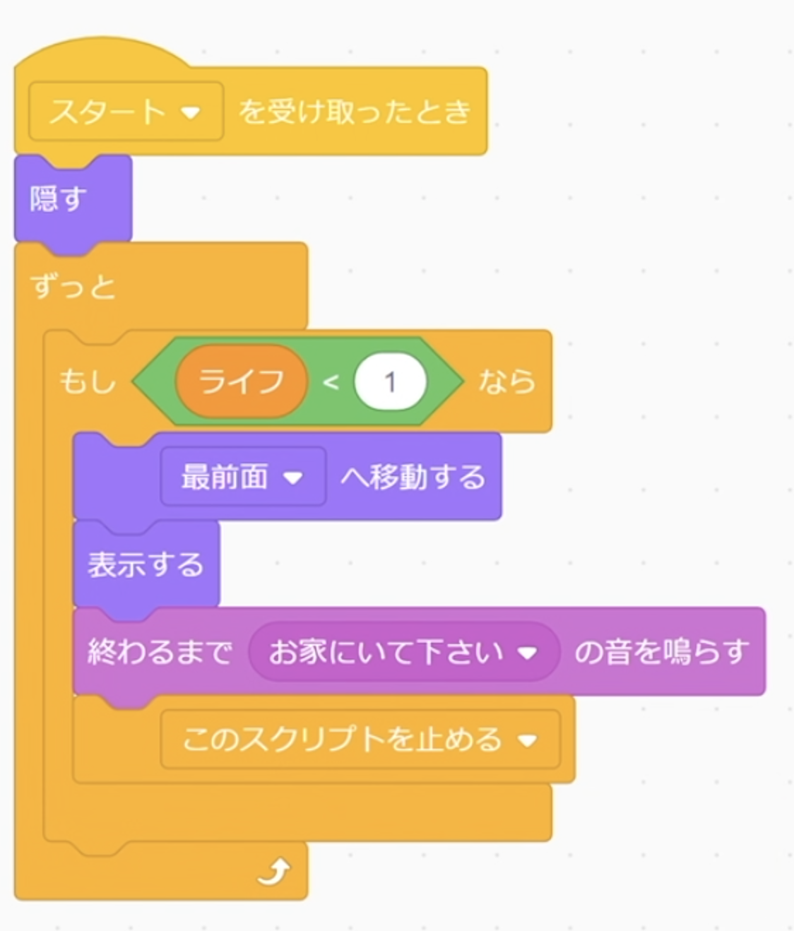 ずっと繰り返していた部分も全て、ライフが0になったら止まるように修正します。
