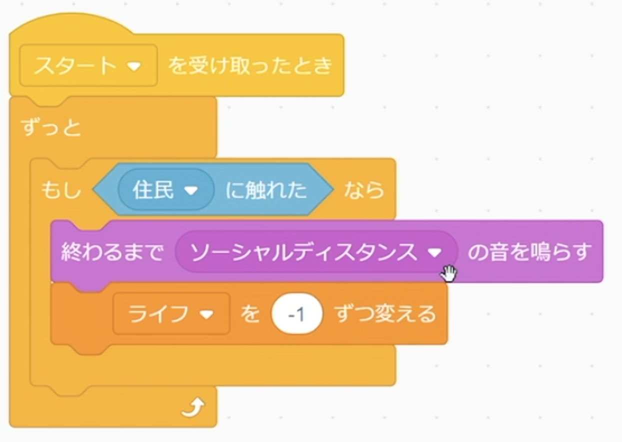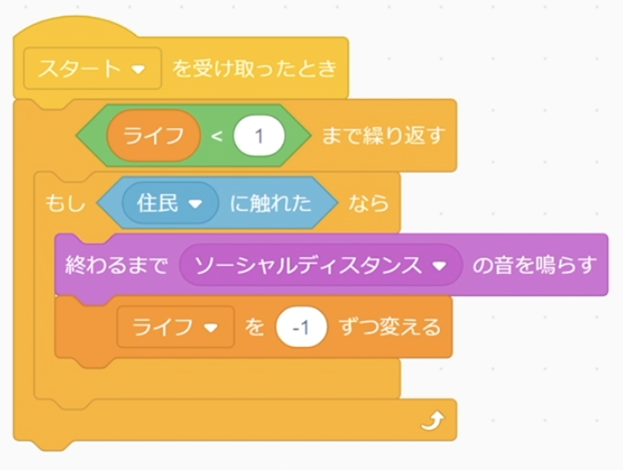 当たり判定が、住民に触れた時にライフが−1になるようにします。