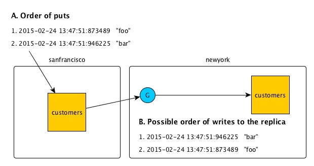 ネットワークの遅延などが生じた場合、古いデータが後から書き込まれる可能性がありますので、レプリカを参照するアプリケーションは書き込みの順番に依存しないよう設計されている必要があります。