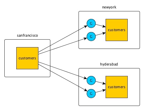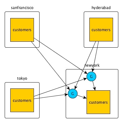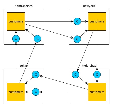 ここでは'sanfrancisco', 'newyork', 'hyderabad'がそれぞれクラスタ名で、'customers'がレプリケーション対象のテーブル、'G'の青丸がgatewayを示しています。