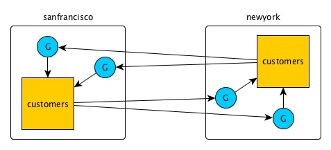下図の例では、'sanfrancisco'と'newyork'クラスタにそれぞれ存在する'customers'テーブルを、それぞれのクラスタに存在するgatewayが更新しあいます。