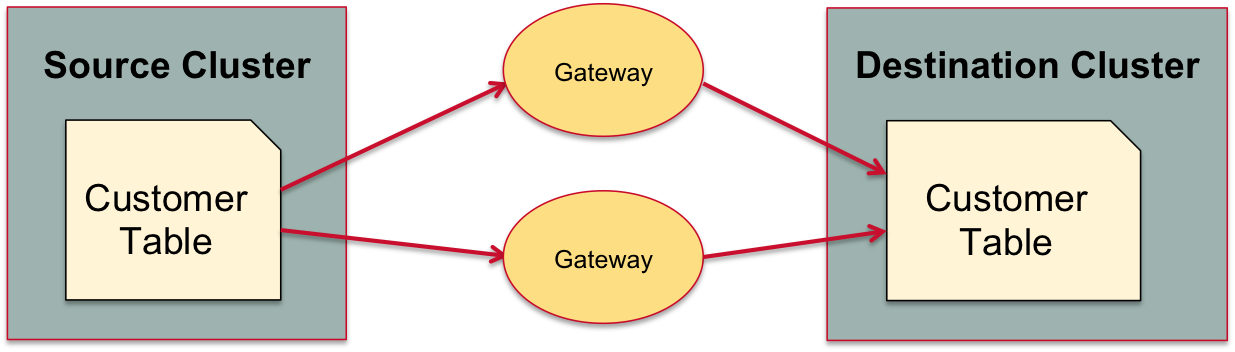 テーブルはレプリケーション先のクラスタで稼働するgatewayプロセスによりバッファされ、レプリケーションされます。