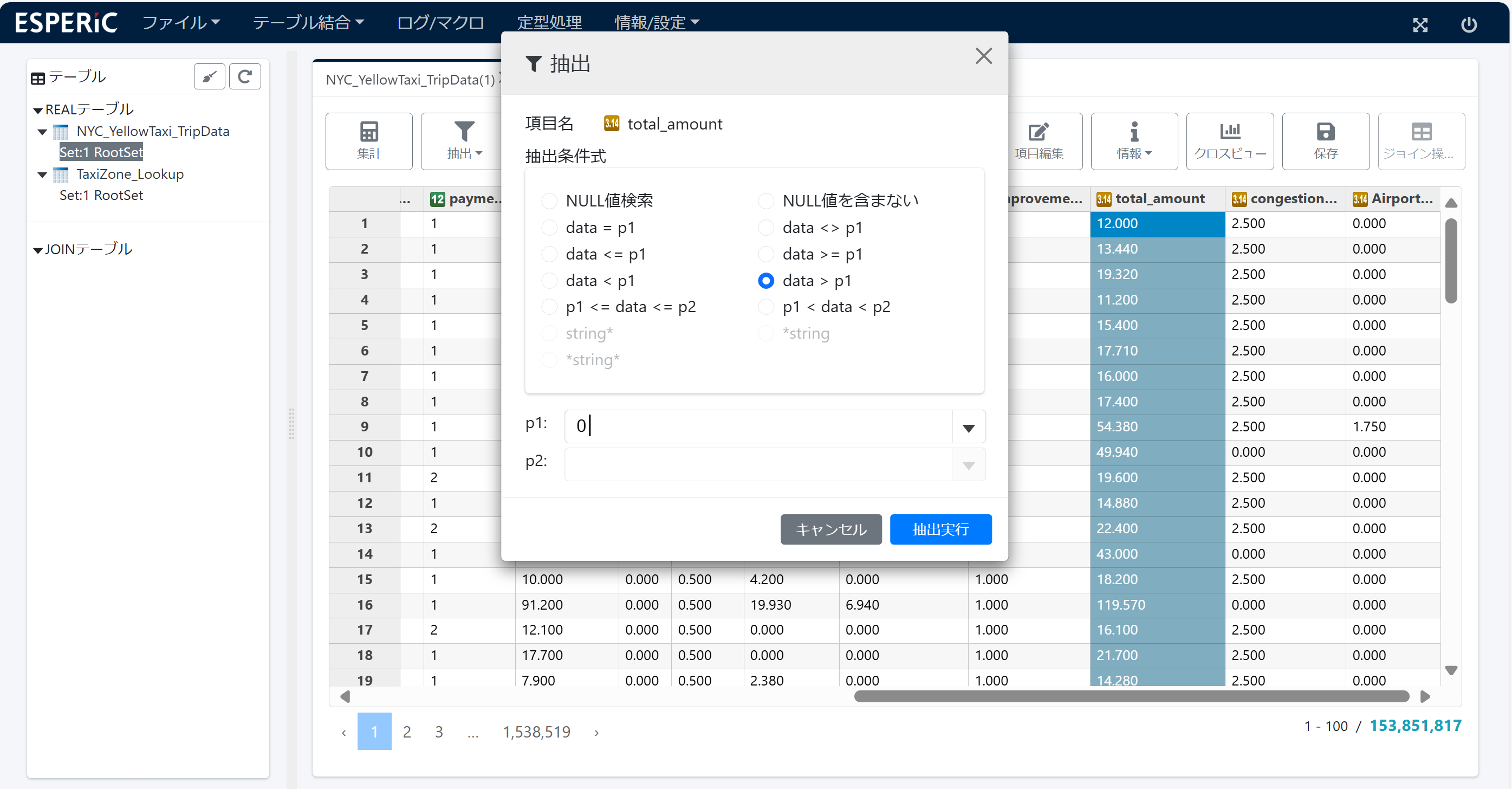 値を抽出したテーブル( Set:2 Search Set:1 [total_amount] > 0 5)が表示されます。画面は 5. 集計 を参照