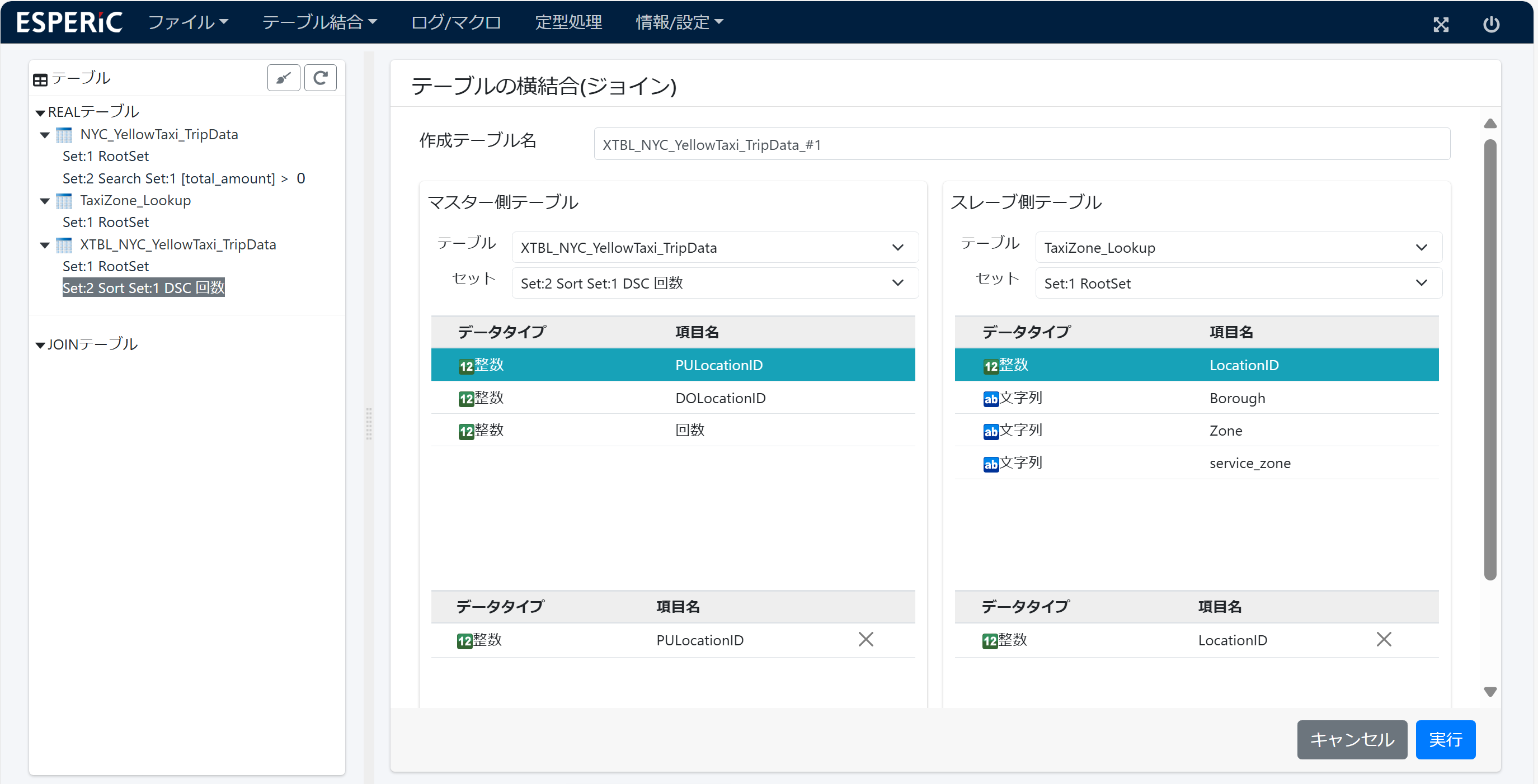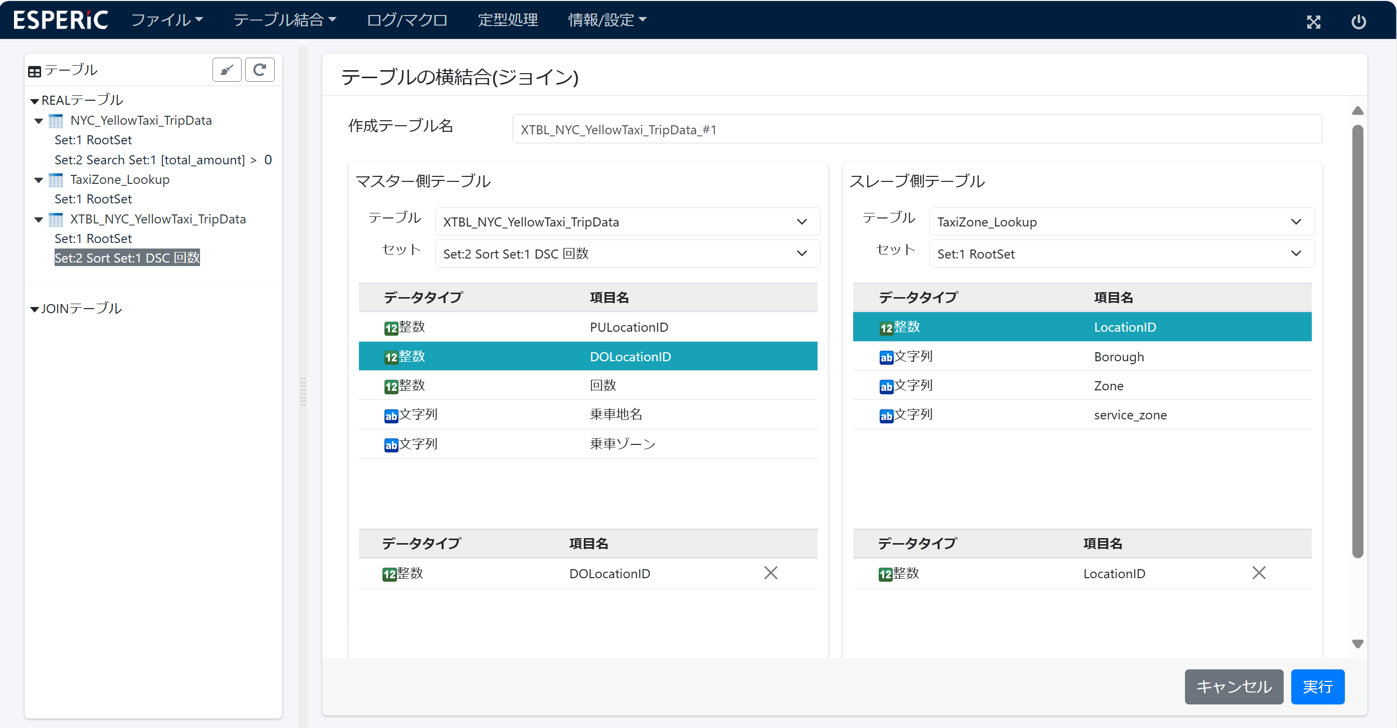 その Set:3 を サブテーブル抽出7で「Top10_YellowTaxi_FareRoutes」という名前のRealテーブルにします。さらに 項目名 PULocationIDとDOLocationID を 乗車地IDと降車地ID に変更し、項目を 回数、乗車地、降車地 の順に並べ替えます。