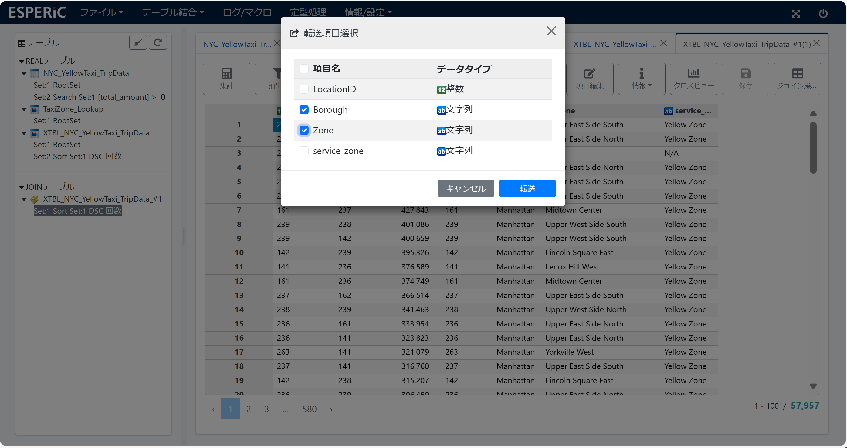 (2)1回目の項目転送... ジョインテーブルの 項目 BoroughとZone を項目転送6します。集計テーブルに 乗車地名(BoroughとZone)が追加されます。