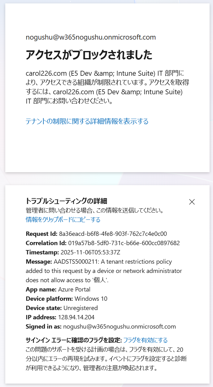 上記の画面は、carol226.com というテナントに参加したデバイスから、w365nogushu.onmicrosoft.com というテナントにサインインした際に ブロック された状態です。