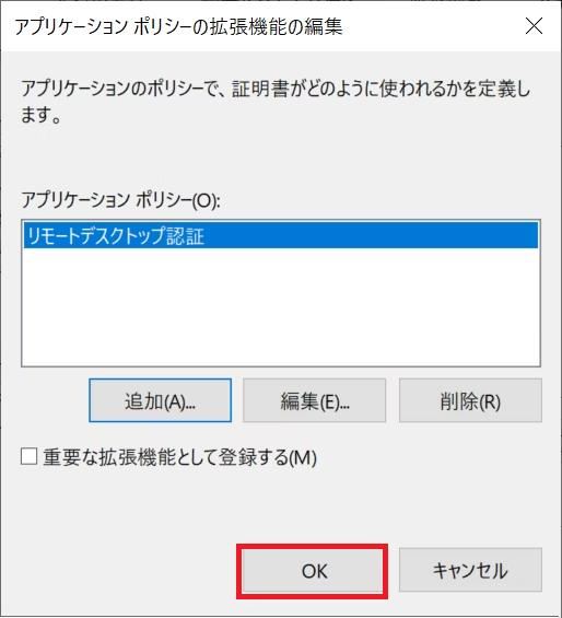 5-f. アプリケーションポリシーの一覧に リモートデスクトップ認証 が加わったので、それを選択して OK ボタンを押します。