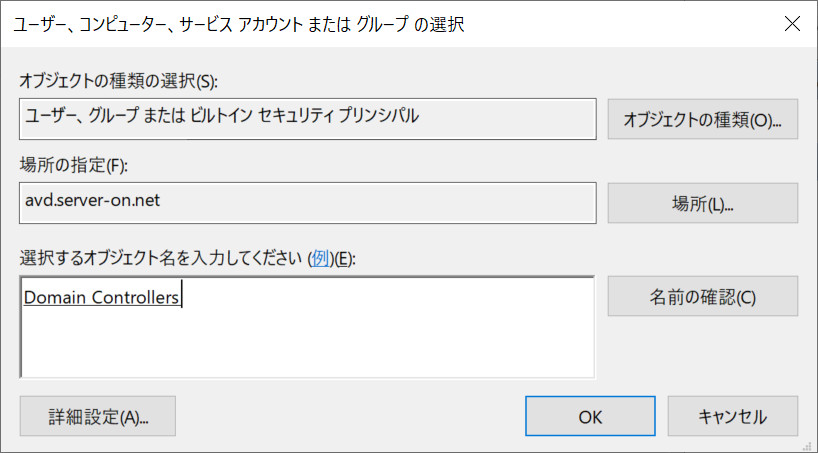 選択するオブジェクト名を入力してください の欄に、Authenticated Users または 許可したい グループ や ユーザー名 を入力して名前の確認 を押します。赤下線のような表示になったら、OK を押します。