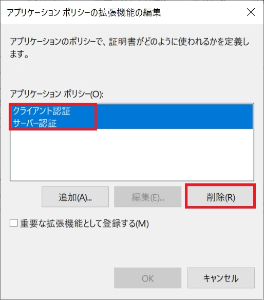 5-b. クライアント認証とサーバー認証を選択して、削除 ボタンをクリックします。